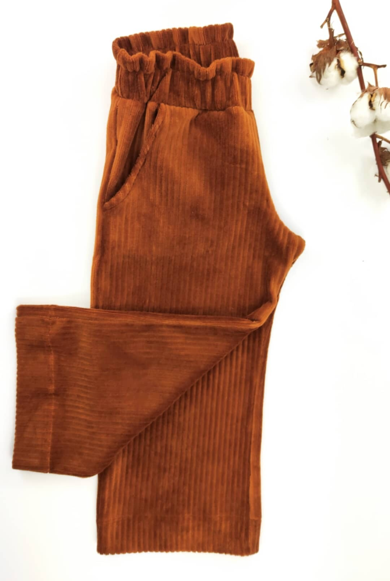 De broek heeft extra brede pijpen en bovenaan een "paperbag" effect. Voor de broek is elke stof met stretch geschikt. Je kan ook een katoen of viscose gebruiken.