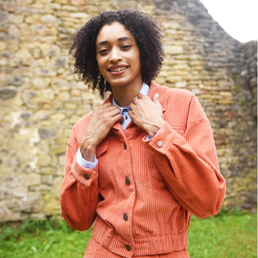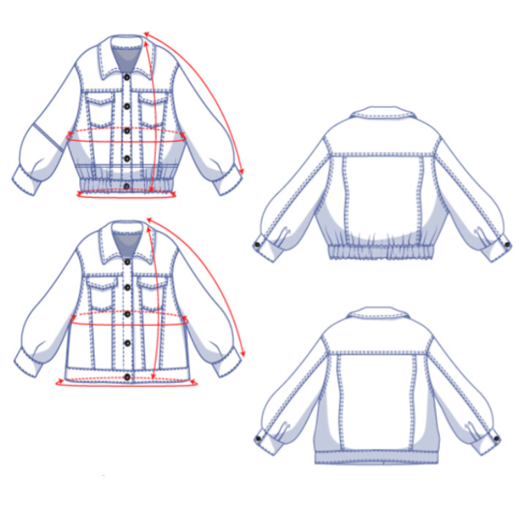 Een trendy upgrade van een klassieke jeansjas: Drew is een hippe, oversized jas in ribfluweel. De korte jas heeft leuke mouwen met plooitjes en stoere details, twee borstzakken, naden in het voorpand en een kraag. Je kan kiezen voor een versie zonder of met elastiek in de zoomboord. Of verleng het patroon en maak een jas voor mannen.